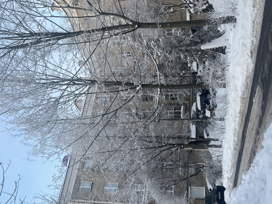 A winter scene captures a brick building partially obscured by snow-covered trees. Window frames are visible on the building's façade. On the right, a street covered in snow with some slush is present. Cars can be seen parked alongside the building with snow accumulated on them. The sky is a pale blue. The trees' branches are covered in a fine layer of frost, creating a delicate, wintry texture.