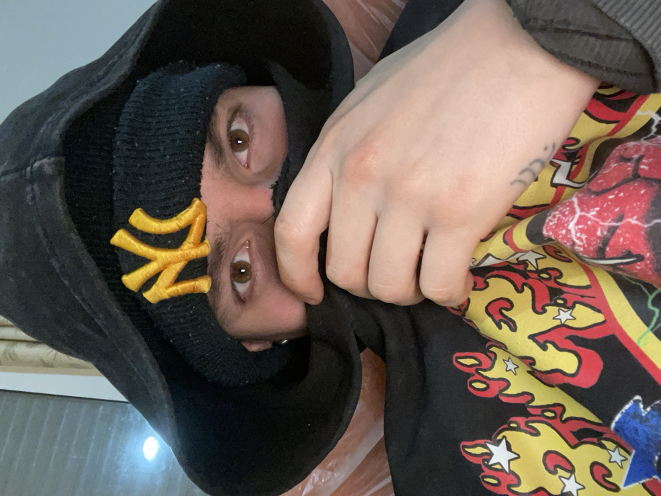 A person with brown eyes and dark hair is wearing a black hoodie and a black beanie with a gold "NY" logo. The hoodie is pulled up, partially obscuring their face. Their hand is raised near their face, holding the hoodie. A graphic t-shirt with flames, stars, and other designs is visible to the right. A small tattoo is visible on the back of their hand. The background appears to be indoors, with a hint of a window and what looks like a wood surface.