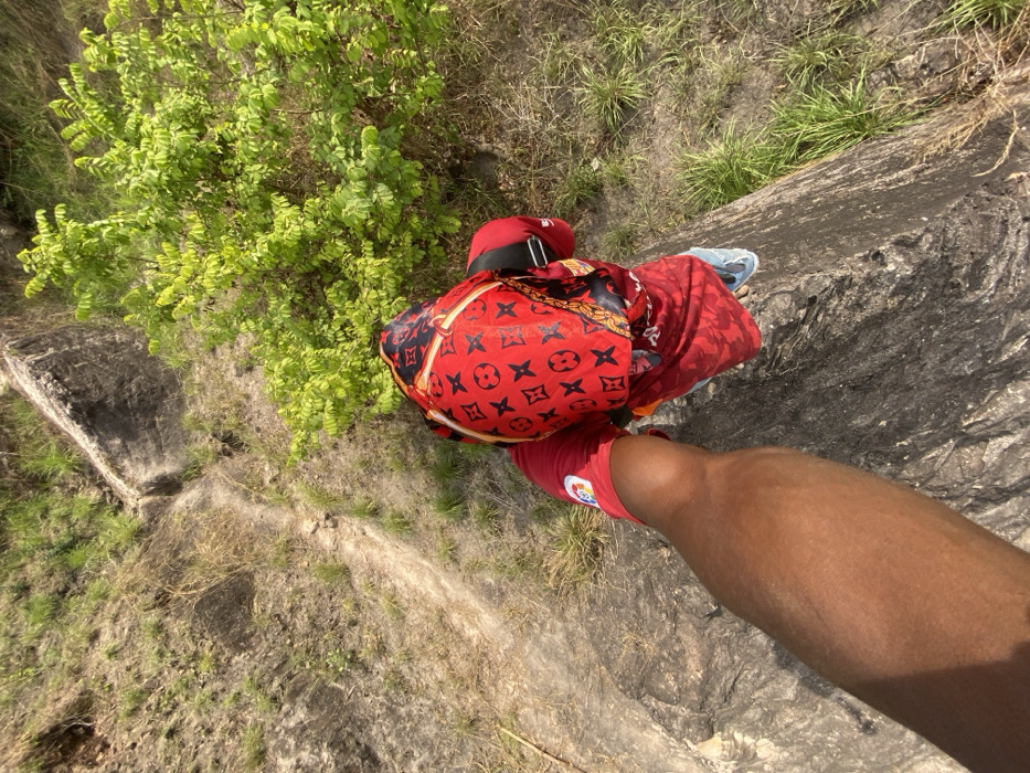 The image, taken in Nguzu Edda, Nigeria, presents a high-angle, downward-looking perspective of an outdoor, rocky landscape under bright daylight. In the lower-left foreground, a dark-skinned arm or leg is partially visible, extending over a rough, grey rock surface. In the midground, a second individual is positioned below and to the right, standing on a rocky ledge with their back to the camera, facing downhill. This individual wears a red garment, possibly a shirt, and a prominent red head covering with black and gold patterned motifs, including stylized "LV" monograms. A black strap, likely from a bag, is visible over their right shoulder. Light blue or grey footwear is visible on their feet. The background reveals a steep, rocky, earthen slope with a narrow dirt path winding downwards. Sparse dry grass and scattered green foliage, including a vibrant green shrub on the right, cover parts of the terrain.