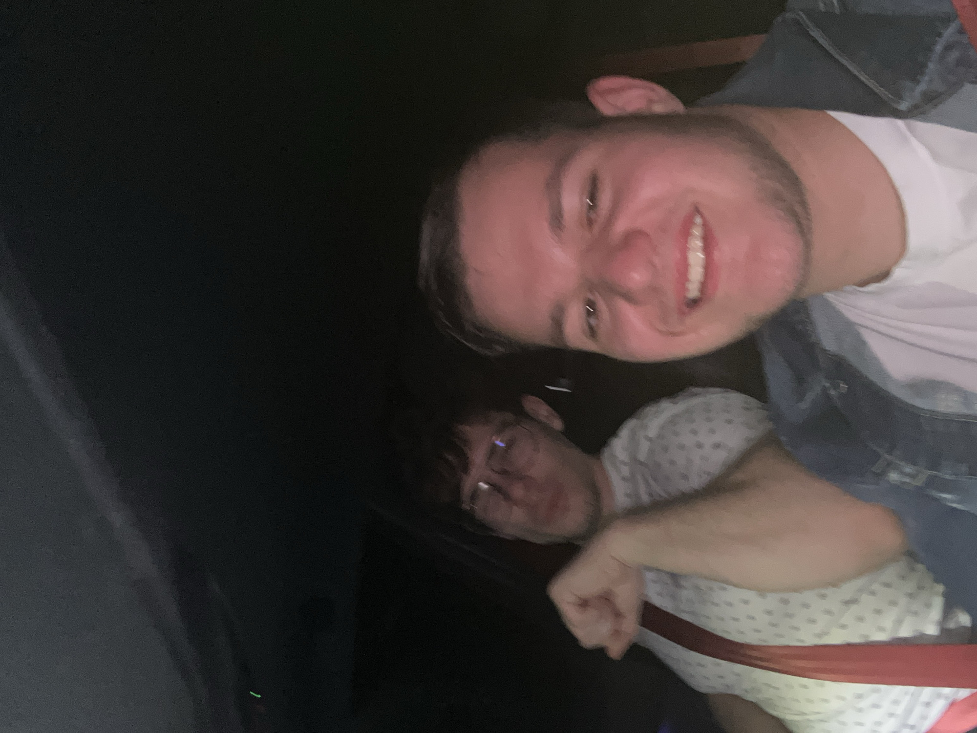 Two men are in a dark environment, possibly a car. The man closest to the camera is smiling and wearing a denim jacket over a white shirt. The second man, wearing glasses and a patterned shirt, is partially visible behind him. A red seatbelt is seen across the second man. The location is not discernible from the visual information provided.