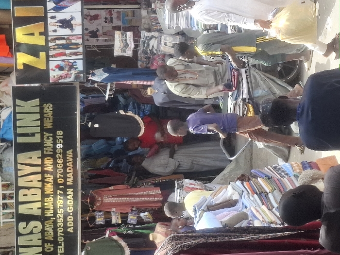 The image captures a crowded outdoor market scene located at Gidan Madawa, Kano, Nigeria
