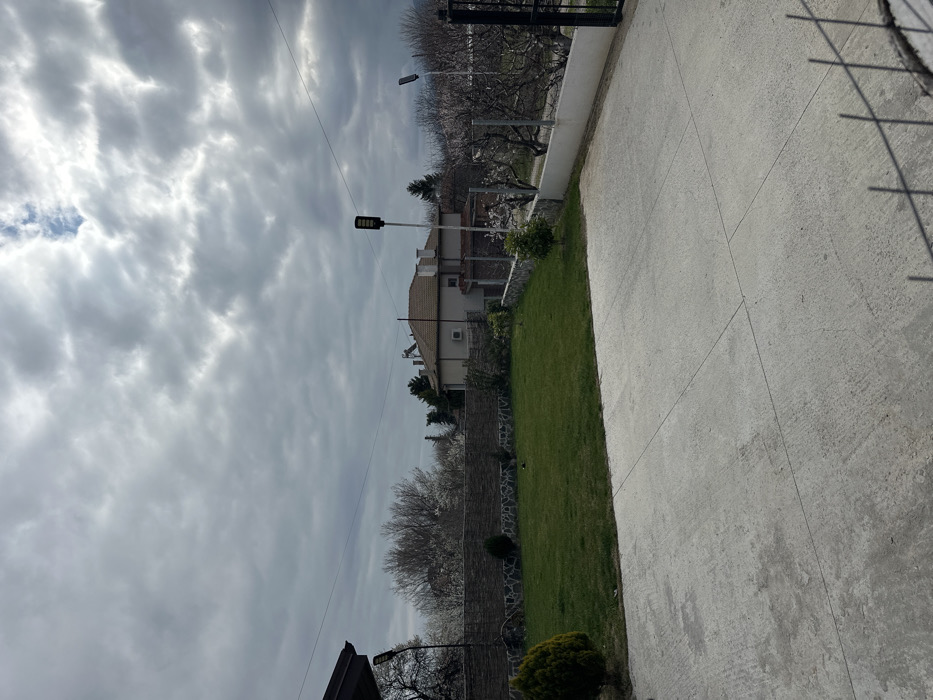 This image presents an outdoor residential scene in Brestnik, Bulgaria, under an overcast sky with visible brighter patches. The foreground features a light-grey concrete slab, sectioned by expansion joints, with a low wire fence partially visible along the bottom edge. To the immediate left of the concrete, a manicured green lawn occupies a significant portion of the midground. A small, dark-green conical shrub is positioned on the left side of the lawn. The rear boundary of the lawn is delineated by a low fence composed of a stone base supporting a woven, light-brown material. Beyond this fence, several trees are visible, some exhibiting white blossoms indicative of spring, while others appear bare-branched. On the right side of the frame, a low, white wall extends from the midground towards the background, featuring metal posts and a dark metal gate. A prominent black, rectangular streetlight with multiple LED panels is mounted on a white pole in the mid-right. Another similar streetlight is partially visible further to the right, behind the wall. In the background, a light-colored two-story house with a red-tiled roof and an exterior air conditioning unit mounted on its side is visible, situated among additional trees and residential structures. Overhead, utility lines traverse the frame horizontally. No individuals or discernable activities are present within the captured scene.