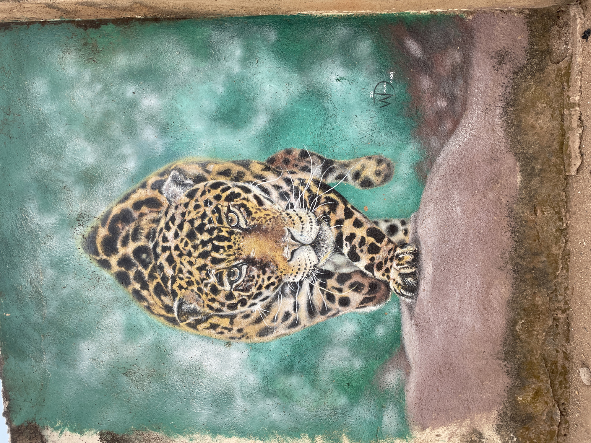 This is a top-down view of a painted mural. The mural depicts a jaguar reclining on a brown rock formation. The background is teal, which gives the illusion that the jaguar is in water. The painting is located in Barakin Lerawi, Nigeria.