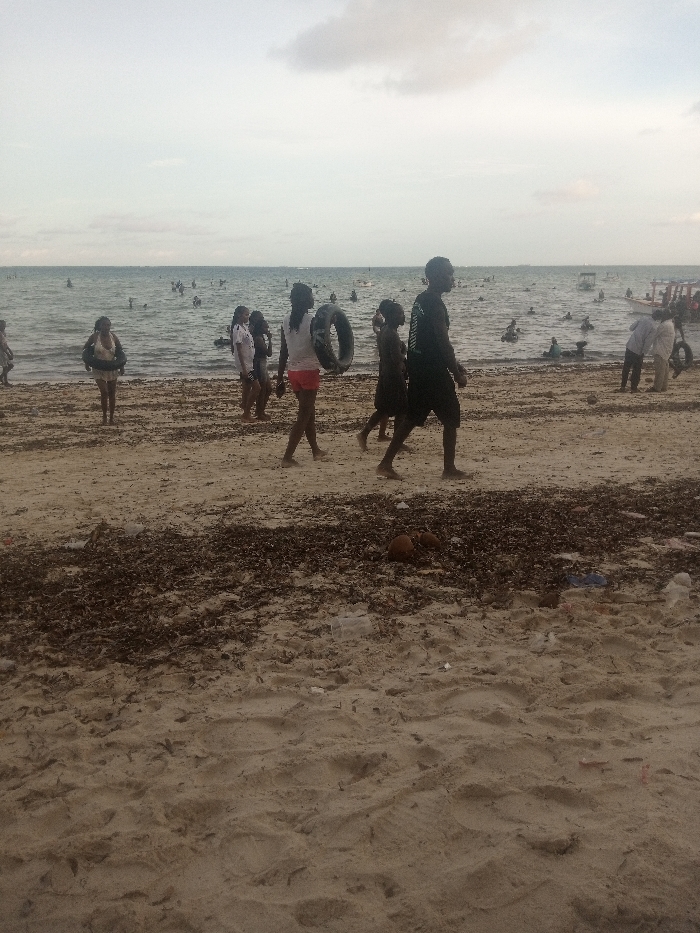 The image depicts a crowded beach scene in Shanzu ward, Kenya, under an overcast sky