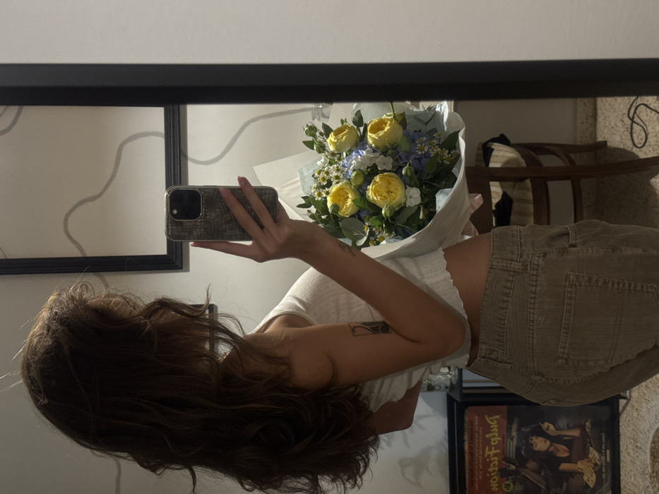 The image depicts a young female, positioned with her back partially to the viewer and angled to the right, taking a mirror selfie indoors in Tel Aviv, Israel. She has long, wavy dark brown hair cascading down her back. The subject is wearing a white, ribbed, cropped tank top with a ruffled hem, revealing her midriff, and light brown corduroy trousers. A tattoo is visible on her right upper arm. She holds a smartphone, encased in a textured dark gray case, in her right hand to capture the reflection. In her left arm, she holds a large bouquet of flowers, primarily featuring prominent yellow roses, smaller blue blooms, and white daisies, wrapped in light-colored paper. The background, visible in the mirror's reflection, includes a light-colored wall adorned with faint, wavy grey line art and a black-framed picture. To the lower left, a framed "Pulp Fiction" movie poster is discernable. Further into the background, a dark wooden chair with a striped upholstered seat and a small table with translucent objects are visible. The floor is light-colored, and a black cable lies on the floor in the lower right. The overall lighting is dim, suggesting an interior setting.
