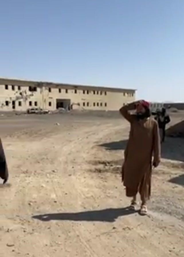 The video depicts a dusty outdoor setting, seemingly in a rural or arid environment. It features several men dressed in traditional Middle Eastern clothing. At the beginning, a man in a brown robe is walking away from the camera, shielding his eyes from the sun with his hand. Two other men are walking behind him. The scene then shifts to show a man with a rifle slung over his shoulder, standing near a beige building. Next, two men are shown facing the camera. Both have beards and are wearing traditional clothing. The man on the left has a scarf around his neck and vest. Finally, the video ends with a man walking away from the camera past rubble and debris. In the distance, there is a long concrete wall and mountains.