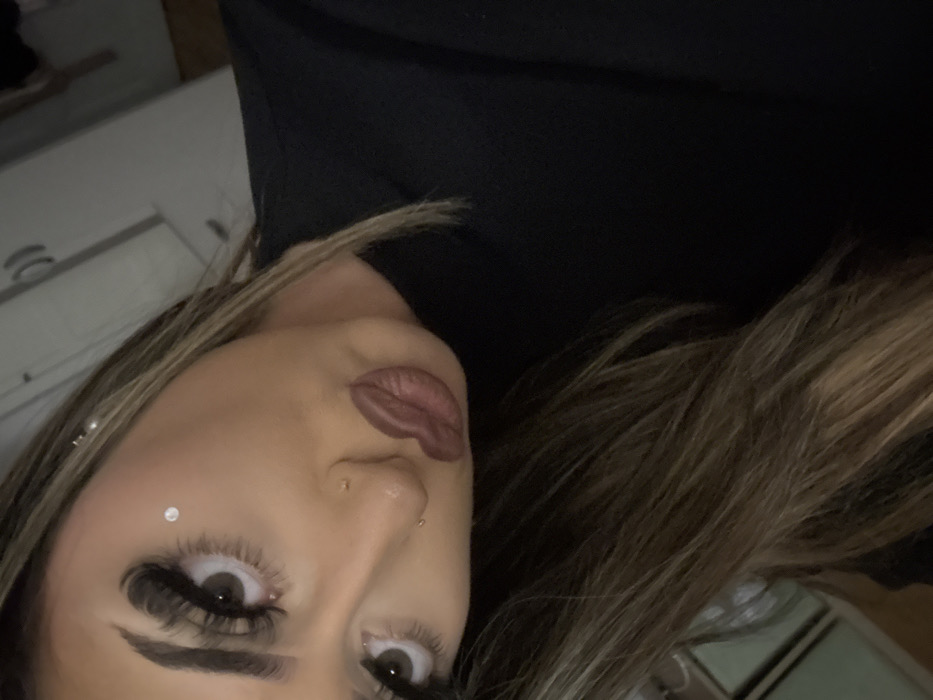 A woman gazes upwards, her head tilted, framed by highlighted brown hair. Her makeup is distinct: thick, dark eyeliner, false eyelashes, and defined eyebrows. A small jewel adorns her cheekbone, and she sports a nose piercing. Her lips are coated in a brown shade. She's wearing a high-necked black garment. The background reveals a glimpse of a white object and a dimly lit room.