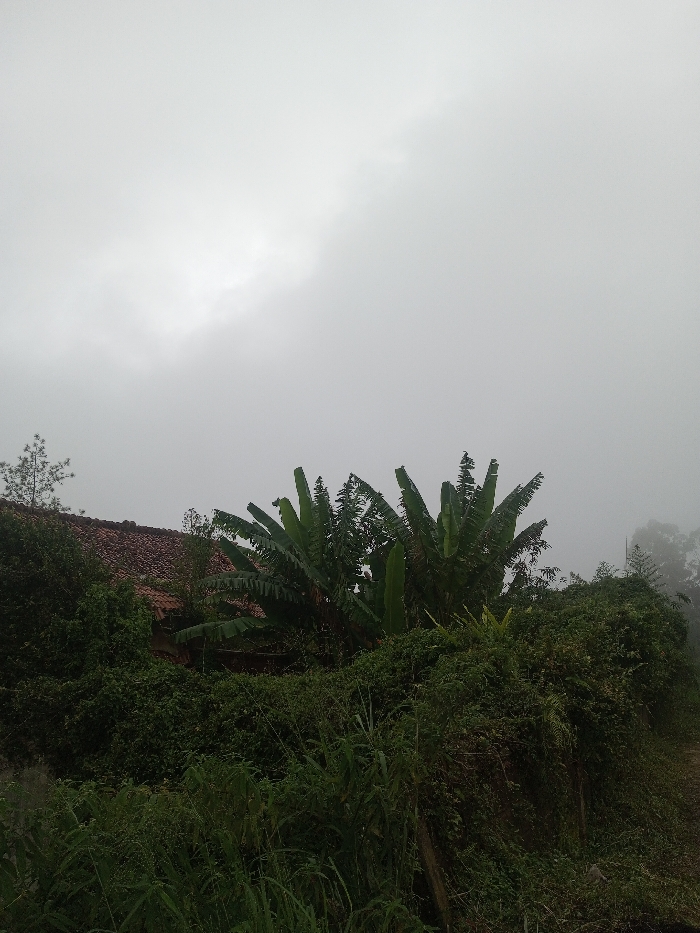 The image displays a foggy, overgrown landscape within Irupalai, Sri Lanka. The upper two-thirds of the frame is occupied by a uniform light gray sky, indicative of heavy fog or low cloud cover, with a brighter diffuse light source appearing in the upper left quadrant. The lower third of the image is densely populated with various green plant life. Prominently in the mid-ground are two clusters of banana trees, characterized by their large, elongated, dark green leaves. To the left and slightly behind these trees, the reddish-brown tiled roof of a building is partially visible, largely obscured by surrounding foliage. A slender, pine-like tree stands further left, reaching towards the sky. The immediate foreground consists of dense undergrowth, including tall grasses and various shrubs. A narrow, unpaved pathway or dirt track is partially visible along the far right edge, ascending into the obscured distance and partially covered by vegetation. No people, animals, or specific activities are observed. The environment appears humid and verdant under diffused light conditions.