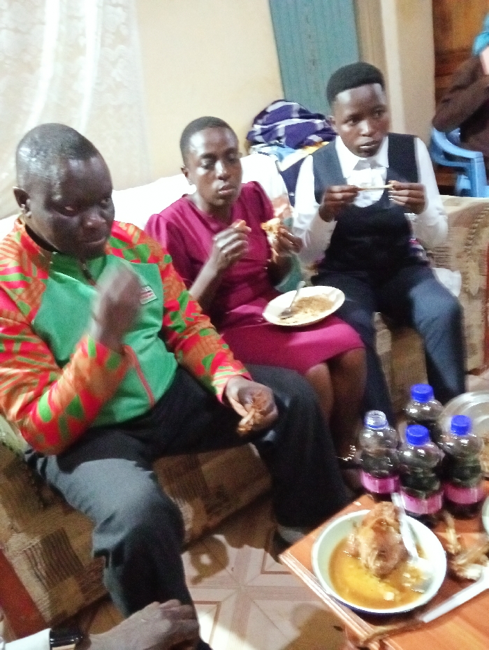 Three individuals are seated on a couch, enjoying a meal together. The person on the left wears a green and red patterned jacket, while the woman in the center is dressed in a maroon dress. The person on the right sports a white shirt and black vest. In front of them is a table with bottled drinks and a plate of food, presumably chicken in gravy. They are all actively eating, creating a scene of shared dining and socializing.