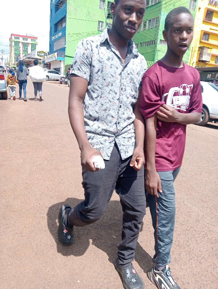 The image displays an urban street scene in Nyeri, Kenya, under bright daylight conditions, evident from distinct shadows cast on the reddish-brown ground. In the immediate foreground, two males walk towards the viewer's right. The male on the left, an adult, wears a light-patterned short-sleeved button-up shirt, dark trousers, and black Crocs-style shoes adorned with small decorative pins. His right hand is clenched, holding a white item, and his left foot is elevated. The male on the right, a younger individual, wears a maroon short-sleeved t-shirt with a white graphic on the chest, dark track pants with a thin orange stripe on the outer seam of the left leg, and dark athletic shoes. He holds his left sleeve with his right hand. In the background, a street extends away from the camera, lined with buildings and other individuals. On the left side of the street, three people—two adults and one child—walk away from the camera. One adult carries a large white bundle over her shoulder. Several vehicles, including a partially visible silver car, are present. Buildings on the left side of the street include a multi-story structure with green and white facades and red roof accents, and further back, a blue multi-story building displaying "STAR TONE" on its facade. On the right side of the street, a multi-story yellow building with visible text, possibly "MAY..." at the top, stands with a white sedan parked nearby.