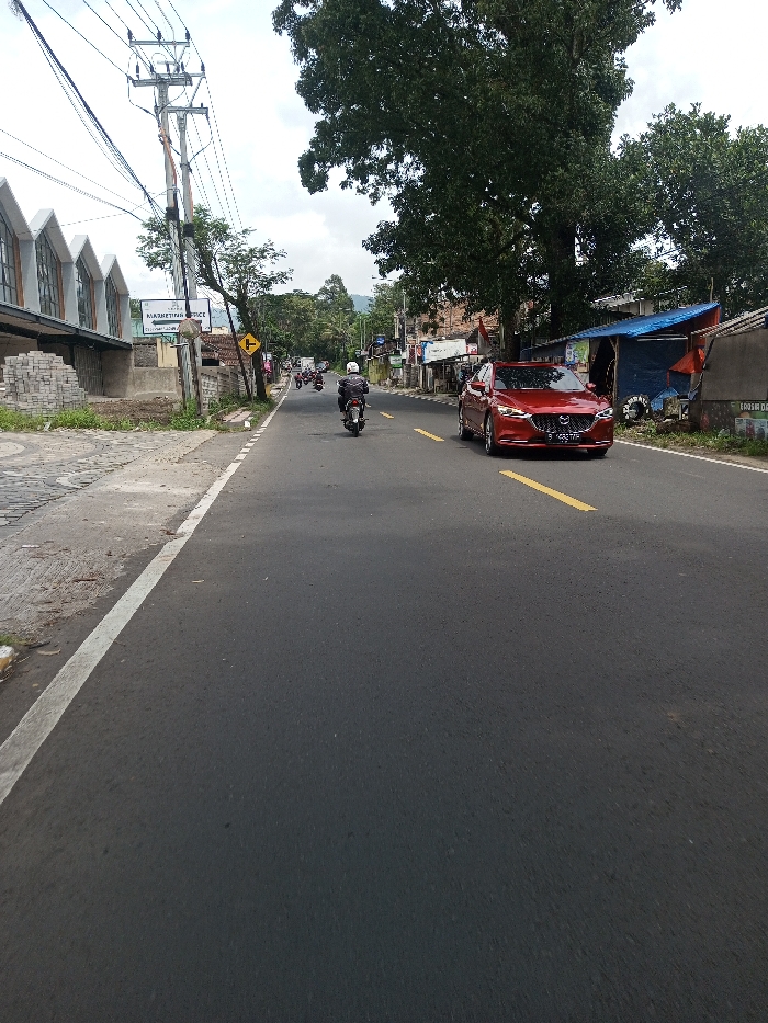 A daytime street scene in Khajuripada, India, captures a two-lane asphalt road under a partly cloudy sky, with a low-angle perspective. The road features a solid white line on its left edge and broken yellow center lines. A red Mazda sedan, displaying the license plate "F 1883 YP", is positioned in the right lane, facing the viewer. In the left lane, a person wearing a white helmet and dark jacket operates a black motorcycle, moving away from the camera. Several additional motorcycles follow in the distance. To the left of the road, a textured gray paved sidewalk runs alongside a modern-style building characterized by a distinct sawtooth roofline and multiple windows. Stacks of gray construction blocks are visible near the building's base. Further left, a utility pole supports numerous power lines extending across the scene. A white rectangular sign below the power lines reads "MARKETING OFFICE" with an arrow pointing left, accompanied by a yellow T-intersection warning sign. The right side of the road is bordered by large, dense green trees overhanging the street. Beneath these trees are various smaller structures, some featuring blue tarpaulin roofs or coverings, indicative of roadside shops or dwellings. In the background, verdant hills or mountains rise under the overcast sky.