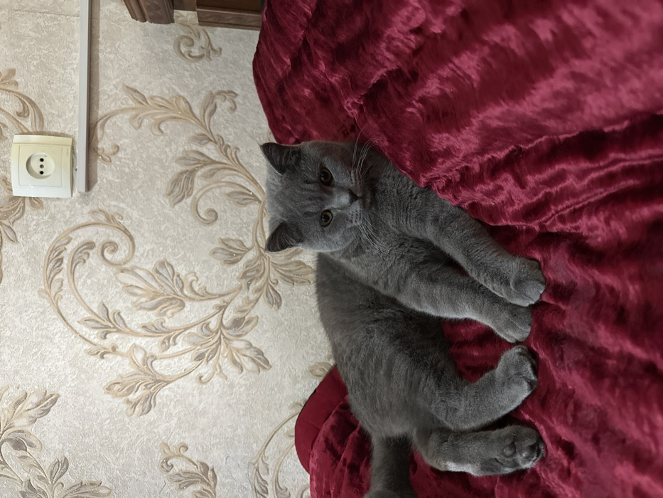 The image depicts an indoor residential scene. A domestic cat, identified as a blue-gray British Shorthair with amber eyes, is the central subject, resting on a rumpled, deep crimson-red textured fabric, likely a blanket or comforter. The cat is lying with its body elongated and head facing forward, its gaze directed towards the viewer. The background consists of a wall covered in light-colored wallpaper featuring a repeating pattern of ornate, scrolled floral or foliate designs in a beige or light brown tone. Mounted on the upper right portion of the wall is a white electrical outlet with three circular sockets. Below this outlet, a narrow, white, horizontal strip, consistent with a cable channel or light fixture element, is visible. A dark wooden furniture piece, possibly a headboard, is partially observable on the far right side of the frame. The environment is that of a private dwelling, consistent with a residential property in Fergana, Uzbekistan, though no specific geographical landmarks are present within the visual evidence to pinpoint the exact location.