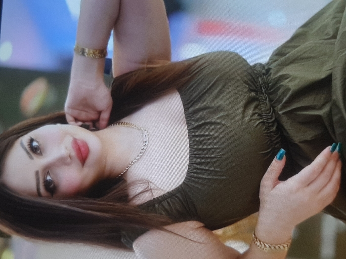 The image depicts a female subject, framed from the upper torso, facing the viewer directly. She has long, dark brown hair styled with a side part, falling over her shoulders. Her facial features include defined eyebrows, prominent winged eyeliner, dark mascara, and full lips accentuated with red lipstick. Her complexion is fair, with blush visible on her cheeks. She is wearing an olive green sleeveless garment, likely a dress or top, with a square neckline. The fabric exhibits a subtle diagonal textured pattern and gathers around the mid-section. Adornments include a gold-colored chain link necklace and a gold-colored patterned link bracelet on each wrist. Her fingernails are painted a dark teal hue. Her left hand is raised, fingers positioned near her temple, while her right hand rests on the lower portion of her garment. The subject exhibits a slight smile. The background is out of focus, revealing blurred beige/light brown textures directly behind her, and indistinct warm (orange/yellow) and cool (blue/purple) light sources or objects further into the distance, consistent with an indoor or artificially lit environment. The specific location of Barza Municipality, Syria, cannot be ascertained from the visual evidence present in the image.