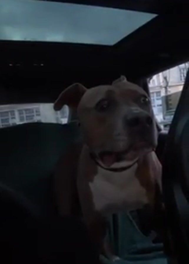 Inside a car, a brown and white American Pit Bull Terrier is sitting on the back seat. The dog is wearing a black collar. The car has a glass sunroof. The car appears to be parked on a city street. A person says, "On va ou, on va a la maison."
