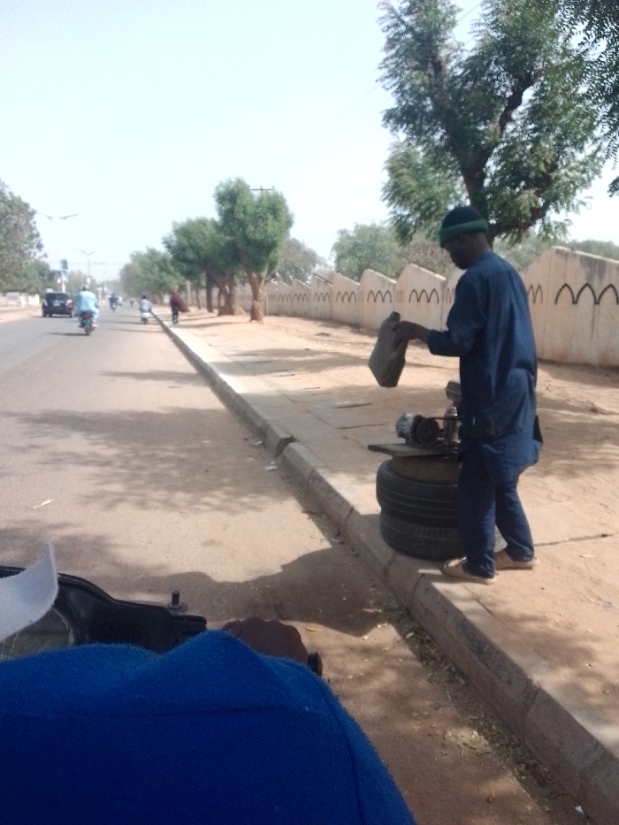 This image depicts a daytime street scene in the city of Unknown, Unknown. In the immediate foreground, a partial view of a person's blue-clad shoulder and a white cap is visible, suggesting the camera's vantage point. To the right, a male subject, dressed in a dark blue tunic, trousers, and a green beanie, stands on a dirt sidewalk. He is holding a dark, rectangular plastic jerrycan, positioned as if pouring liquid towards a small, belt-driven machine mounted on a wooden board. This machine rests on two stacked tires and displays metallic components. To the left of the subject, a paved road with a concrete curb extends into the distance. Vehicles, including a dark sedan and at least two motorcycles with riders, are observed moving away from the viewer on the road. The background features a low, light-colored concrete wall adorned with a repetitive dark arch motif, backed by a row of mature trees with green foliage. The sky is clear and bright, and shadows are cast on the ground, consistent with direct sunlight.