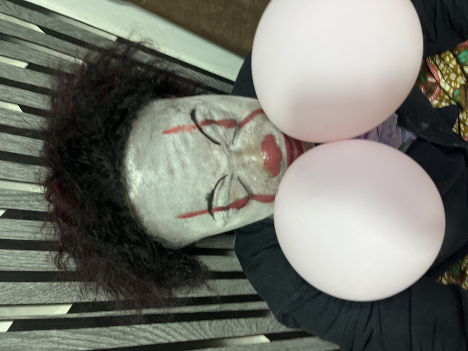 The image displays a close-up, chest-up view of an individual adorned with white face paint, prominent red marks resembling tears extending from the forehead over the eyes and down the cheeks, and red-painted lips. The eyes appear closed or heavily made up to seem so, with black lines extending from the outer corners. Dark, curly hair is visible at the top of the head, some strands showing reddish tones. The individual wears a black long-sleeved top, with a segment of colorful, patterned fabric visible beneath it, suggesting an additional layer or garment. Two light pink balloons are positioned centrally in the foreground, obscuring the lower portion of the individual's face and upper chest. The background features a uniform pattern of alternating dark and light vertical stripes. The specific location within Accra, Ghana, cannot be determined from the visual information in the image.