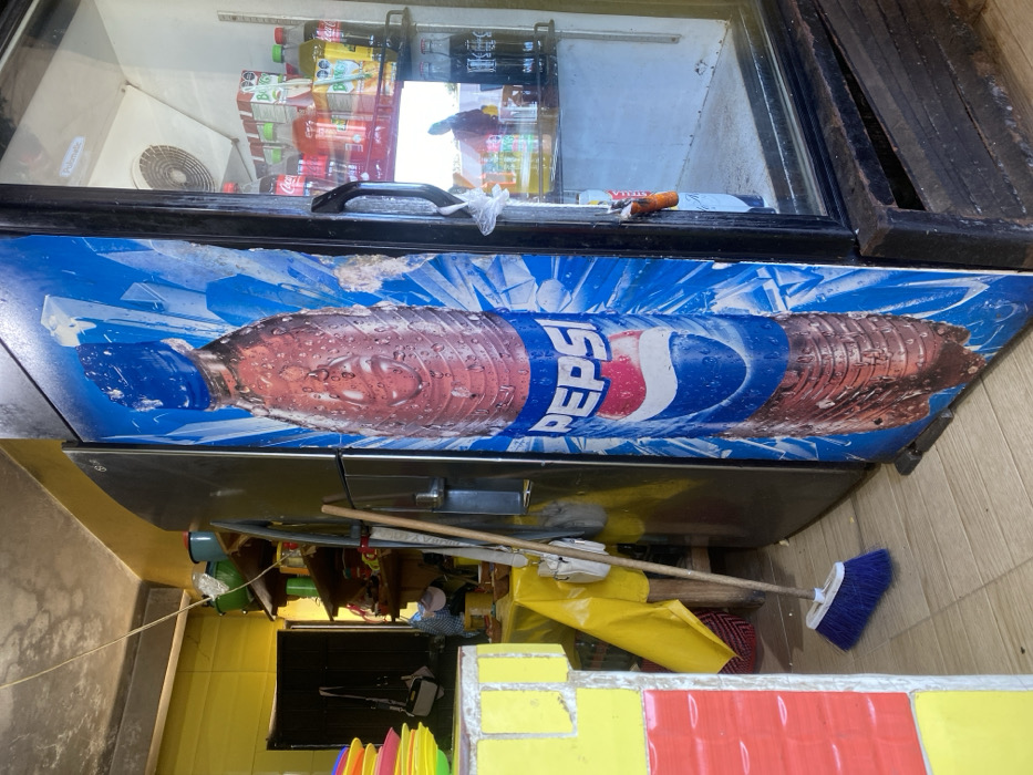 A worn Pepsi cooler with a large bottle graphic sits above a cluttered counter area. The cooler's glass top reveals various drinks inside. Below, a yellow and red tiled surface is visible, along with a broom, a wooden stick and other cleaning supplies. The floor is tiled and a dark colored object is partially visible. The overall scene suggests a small, possibly untidy, retail or food service setting.