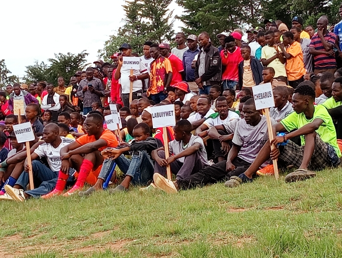 The image displays a large outdoor gathering of predominantly male individuals on a grassy incline in Ngenyilel ward, Kenya. In the foreground, approximately fifteen to twenty young men are seated directly on the green grass, facing generally left. Several of these individuals hold white rectangular signs mounted on wooden sticks; visible labels include "MOGOYIWET," "KAPK," "LABUIYWET," and "CHEBARUS." Their attire varies from casual t-shirts, jeans, and shorts to sports-related clothing such as football jerseys and brightly colored sports socks. Behind the seated group, a dense crowd of hundreds of people, primarily males spanning various age groups, stands watching in the same general direction. One individual within this standing crowd holds a sign labeled "BUKWO," and another is observed looking at a smartphone. The environment consists of a verdant grassy field, with trees visible in the distant background beneath an overcast sky.