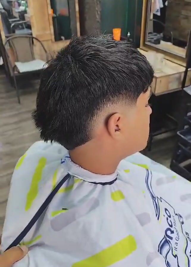 person with dark, short, wavy hair in a barber's chair, wearing a white barber's cape with yellow and gray designs. The hair is styled with a fade on the sides and back. A hand reaches into the frame to adjust the cape around the person's neck. The barber shop setting includes a mirror, barber's station, chairs, and various grooming products. The camera moves around the person, showing the haircut from different angles.