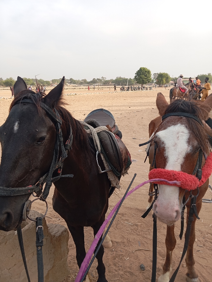 Two horses, one dark and one light brown with a white blaze, stand in a sandy area. Both are saddled and bridled, with the brown horse sporting a red decorative piece on its face. In the background, people ride horses, while others gather near parked motorcycles, all under a hazy sky. Structures are visible in the distance, marking the edge of the open area.