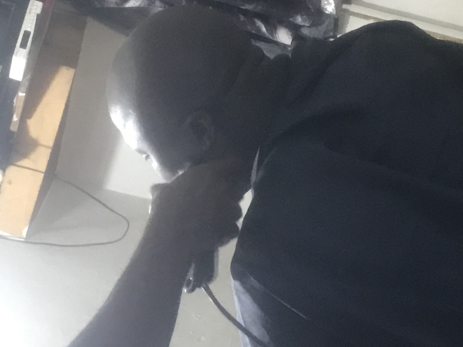 The image depicts an indoor scene where an individual is being shaved. A bald male, wearing a dark garment, is seated and angled with his right profile visible, looking slightly upwards. Another individual's right arm and hand are visible, holding a dark electric shaver with an attached cord. This individual is actively using the shaver on the seated male's jawline or neck area. In the background, a light-colored wall is present. Above the seated male's head, a wooden shelf holds multiple electronic devices and cables. The lighting is moderate, with a highlight visible on the bald male's scalp. The scene provides no discernible visual information to confirm the specific location within the city of Jos, Nigeria.