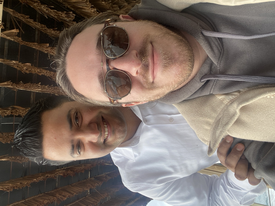 Two adult males are depicted in a selfie, set in Petrovac centar, Montenegro, within a structure featuring a roof constructed from dried fibrous material. The subject positioned in the foreground, to the right, appears Caucasian, with light brown hair styled back, a light brown beard, and is wearing tortoiseshell-framed sunglasses, a grey hooded sweatshirt, and a light beige outer garment. He is smiling directly at the camera. The subject positioned behind him, to the left, appears to be of South Asian or Middle Eastern descent, with dark hair styled upwards, clean-shaven, and is wearing a white collared shirt. He is also smiling, with his right hand resting on the foreground subject's left shoulder. A muted blue tone, consistent with water or sky, is visible in the lower-left background.