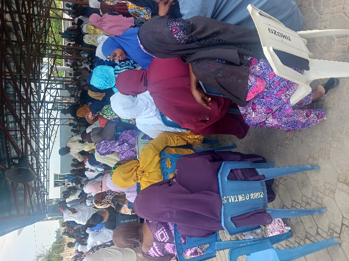 This image depicts a large public gathering in Nagazi, Nigeria, occurring under a metal-framed roof structure on light-colored paved ground