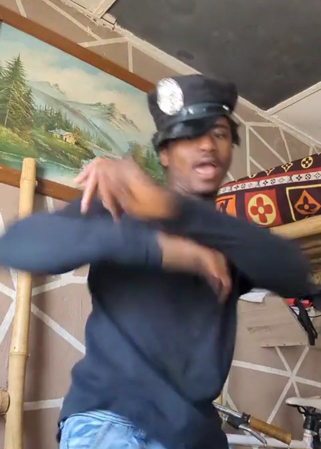 A young man is dancing in a room. He's wearing a black long-sleeved shirt, light blue jeans, and a police officer's hat. He's making hand gestures as he moves to the music. In the background, there's a painting of a mountain scene, a bamboo ladder or structure, and a patterned cushion on a bamboo frame. The wall has a geometric design. There is a bicycle behind him.