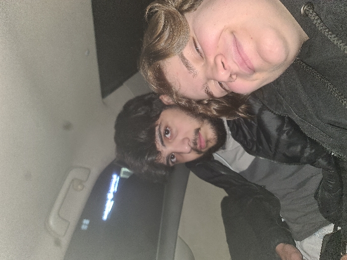 two males seated inside a vehicle, likely a car, during a low-light period, possibly night