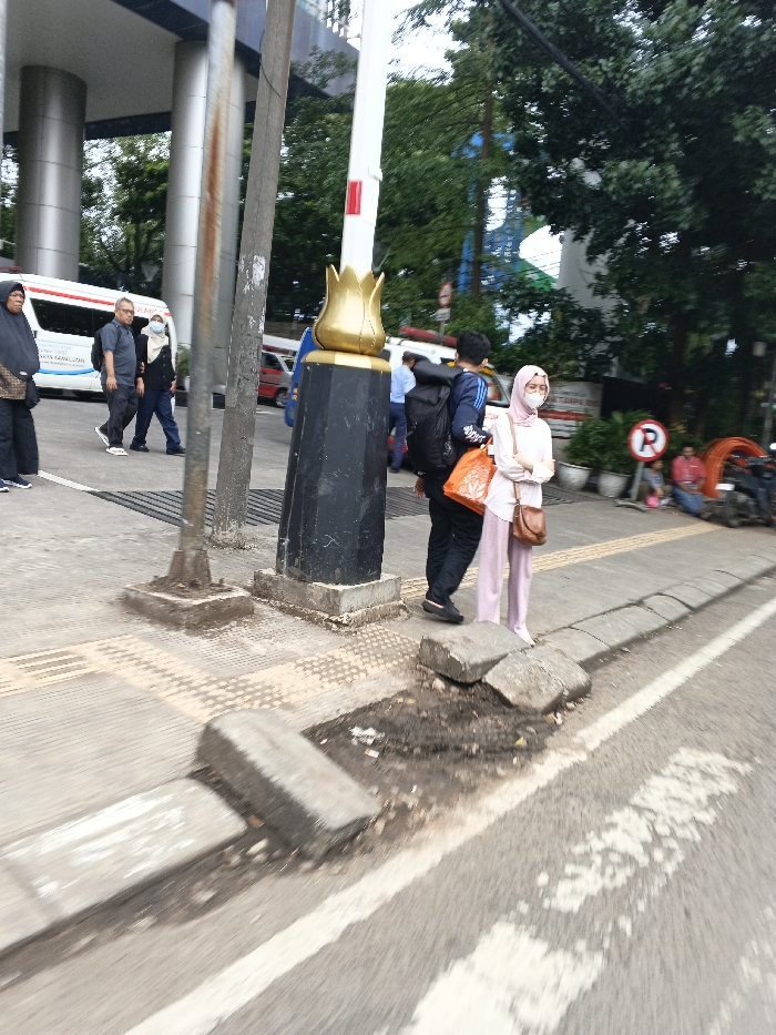 A street scene shows pedestrians on a sidewalk next to a road. A woman in a hijab and face mask stands near a man with a backpack. A damaged curb and pavement are visible in the foreground. In the background, other people walk near a white ambulance and a building with columns. A parking sign and trees are also present. The photograph appears to be taken from a moving vehicle.