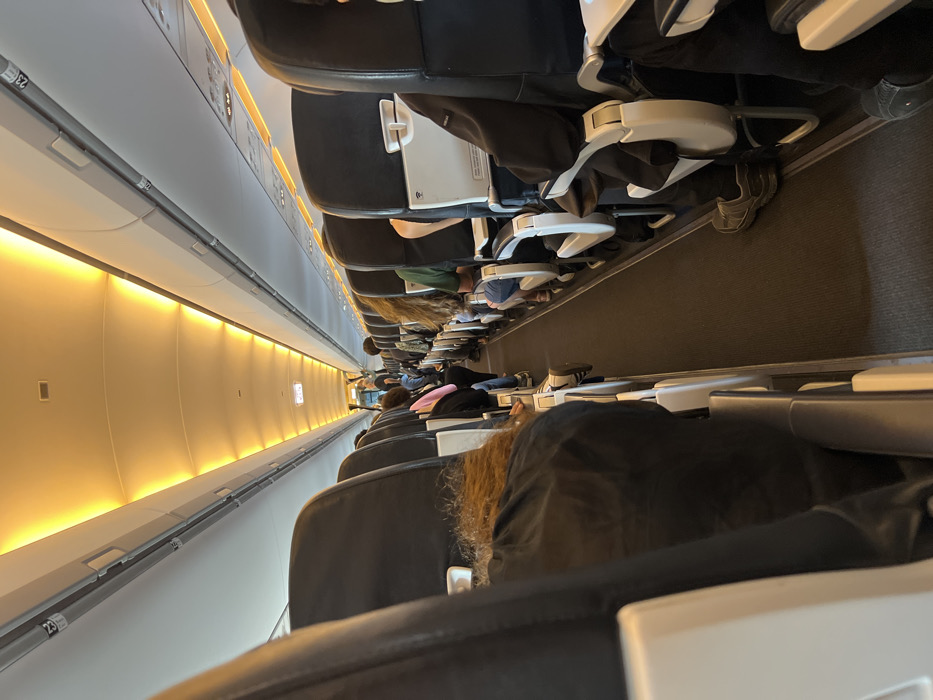 - "The image displays the interior of a commercial passenger aircraft cabin, observed from a forward-facing perspective, with the aircraft presumed to be located within Le Mesnil-Amelot, France" by FM-t80Kg1, licensed under CC BY 4.0