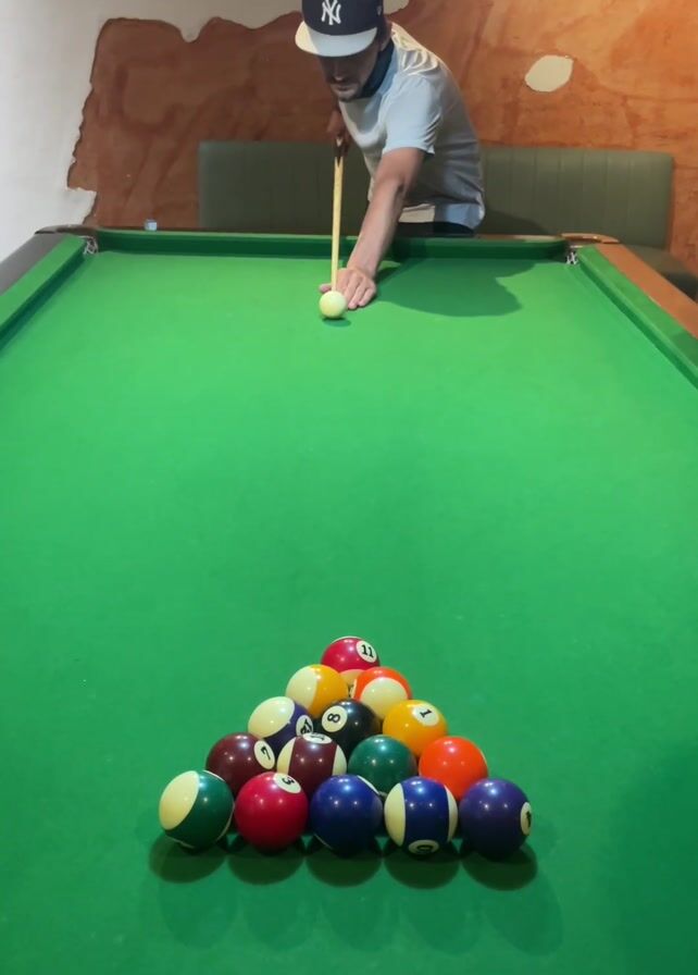 A medium, eye-level shot shows a man in a baseball cap setting up to break in a game of 8-ball