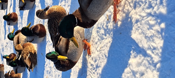 - "A group of approximately fifteen mallard ducks are positioned on a snow-covered surface in Novoe Devyatkino, Russia" by FM-FrnGi2, licensed under CC BY 4.0