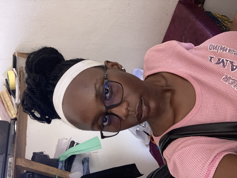 The image displays a single female individual with dark skin, dark braided hair styled in an updo, and a white headband, situated indoors in Barden Yana, Nigeria