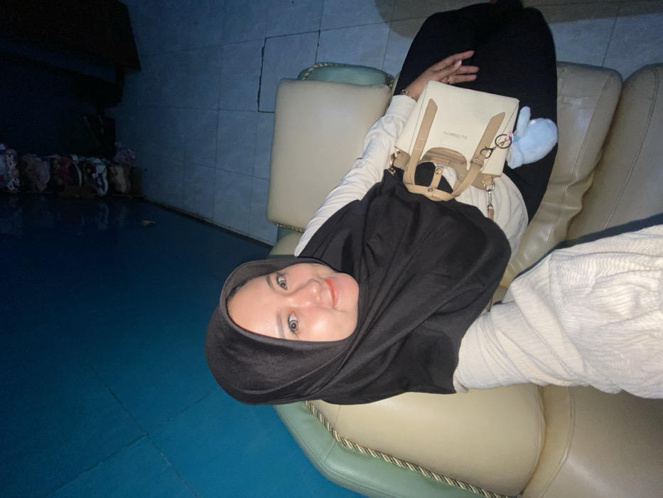 A female individual, facing forward with a slight smile, is seated on a light beige upholstered armchair with a green and gold trim. She wears a black hijab, a light-colored long-sleeved top, and dark lower garments. A small, light-colored handbag, bearing the brand "ELIZABETH" and adorned with a light blue fuzzy charm, rests on her lap. The immediate background on the left consists of a solid blue wall. To the right, a multi-tiered shelving unit holding various items is visible against a darker wall section, above a light-colored tiled floor. This scene is located indoors in Gelam, Indonesia.