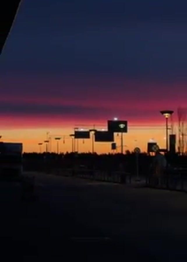 static shot of an empty road at twilight with a vibrant sunset filling the sky. The sky transitions from a deep blue at the top to a bright orange near the horizon. Silhouetted against the colorful sky are streetlights, traffic signs, and overhead road signs. A vehicle with headlights on moves from left to right along the road. A sign with an "X" is in the foreground to the right. A piece of architecture, possibly a building overhang, partially obscures the view from the top left. A crane is visible in the background on the right.