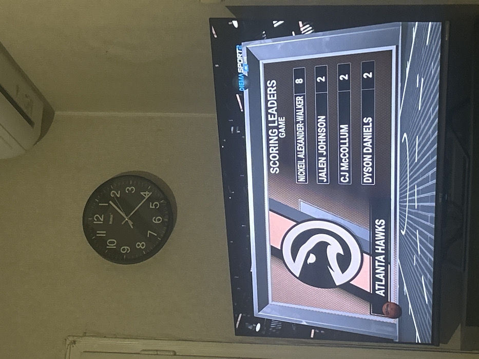An indoor scene in a room in Varna, Bulgaria, depicts a television screen and a wall-mounted clock under dim, warm lighting. A circular black wall clock, branded "Bubos," is affixed to a light-colored wall, displaying a time of approximately 1:50. A white split-unit air conditioner is mounted high on the wall in the upper right corner of the frame, and a vertical white door frame or trim is visible along the left edge. The lower portion of the image is dominated by a flat-screen television displaying a sports broadcast graphic titled "SCORING LEADERS GAME." This graphic features the Atlanta Hawks logo and team name on the left, with a small basketball depicted below. On the right, a list shows player scores: Nickeil Alexander-Walker with 8 points, and Jalen Johnson, CJ McCollum, and Dyson Daniels each with 2 points. The channel "DIEMA SPORT 2 LIVE" is visible in the top right corner of the television screen. No individuals are present in the image.