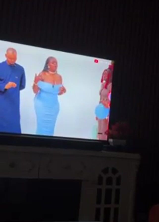 television screen displaying a game show. Three people are on the screen: a man wearing a blue robe, a woman wearing a light blue dress, and a woman with red hair holding a light blue balloon. The woman in the dress is gesturing with her hands as if she is speaking. The television is sitting on a white cabinet with arched designs on the doors. The room is dark, and there is a table with items on it in the foreground. The wall behind the cabinet has vertical stripes.