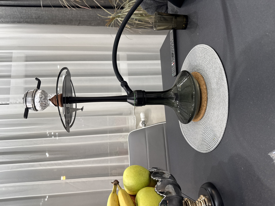 An indoor scene in what appears to be a private residence in the city of Pazardzhik, Bulgaria, is depicted from a low-angle perspective, focusing on a dark-colored table. Centrally positioned on the table is a black-stemmed hookah with a smoky-grey glass base, resting on a circular cork coaster which in turn sits on a light grey woven placemat. The hookah's bowl, made of reddish-brown clay, is covered with crinkled aluminum foil and topped by a metallic heat management device. A black hose is attached to the hookah's stem and extends towards the right. To the left of the hookah, an ornate silver-colored footed fruit bowl with a scalloped edge contains a cluster of yellow bananas and several green apples. Further to the right on the table, a dark, translucent drinking glass stands near a black remote control. In the background, a large window is covered by sheer white curtains, with a section of darker grey curtains visible to the right. A grey and white chair is partially visible to the left background, and a potted plant with long, thin leaves can be seen in the far right background. No individuals are present in the image.