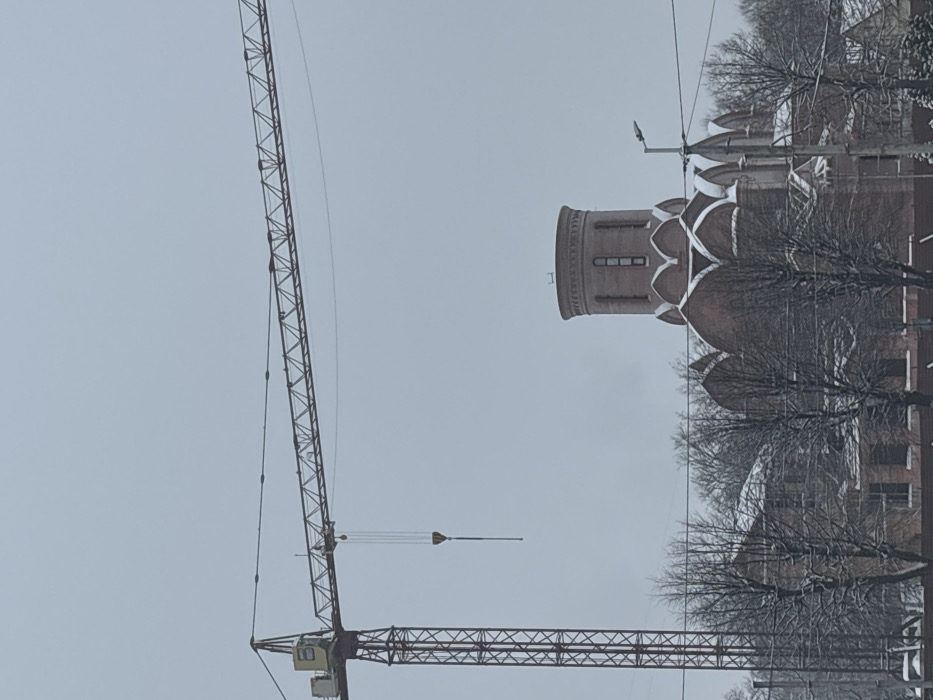 The image presents a winter urban scene in Kaliningrad, Russia, featuring the Church of the Holy Great Martyr George the Victorious on Gorkogo Street. The sky is uniformly overcast and light grey. A large red-brown lattice tower crane occupies the left side, its horizontal jib extending across the upper portion of the frame. A hoist cable with a hook and a slender, vertical weight is suspended from the crane's jib. The crane's operator cabin is visible near the top of its vertical tower. To the right, the upper and mid-sections of a prominent red-brick Orthodox church are visible. The church features a distinctive cylindrical tower or drum with three vertically stacked, narrow arched windows, capped by a plain circular top. Below this tower, the roofline is characterized by multiple arched brick structures, all lightly covered in snow. A dense cluster of bare deciduous trees, also dusted with snow, partially obscures the lower sections of the church and other adjacent brick buildings. A dark utility pole with a streetlamp and overhead power lines is positioned on the far right. The ground and all visible horizontal surfaces exhibit a thin layer of snow, indicative of cold weather. No individuals are present in the scene.