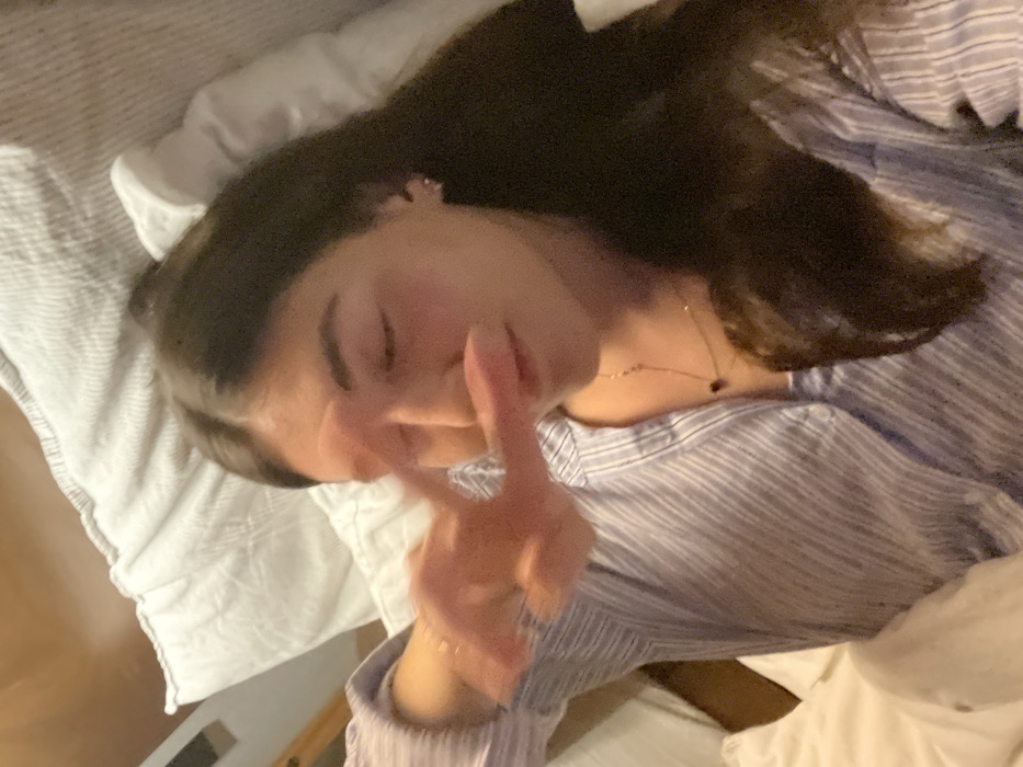 The image displays a female subject lying in a bed, located indoors in Avandaro, Mexico. The subject, possessing long dark hair, is oriented on her right side, facing generally towards the viewer. She is attired in a light-blue and white striped long-sleeved shirt. A delicate gold-toned necklace with a small, dark pendant is visible on her neck, and a small stud earring is present in her right ear. Her left hand is raised in front of her face, performing a "peace" sign gesture with the index and middle fingers extended. Her eyes are partially obscured or appear to be closed. The immediate background consists of white or light-colored pillows and bedding material.