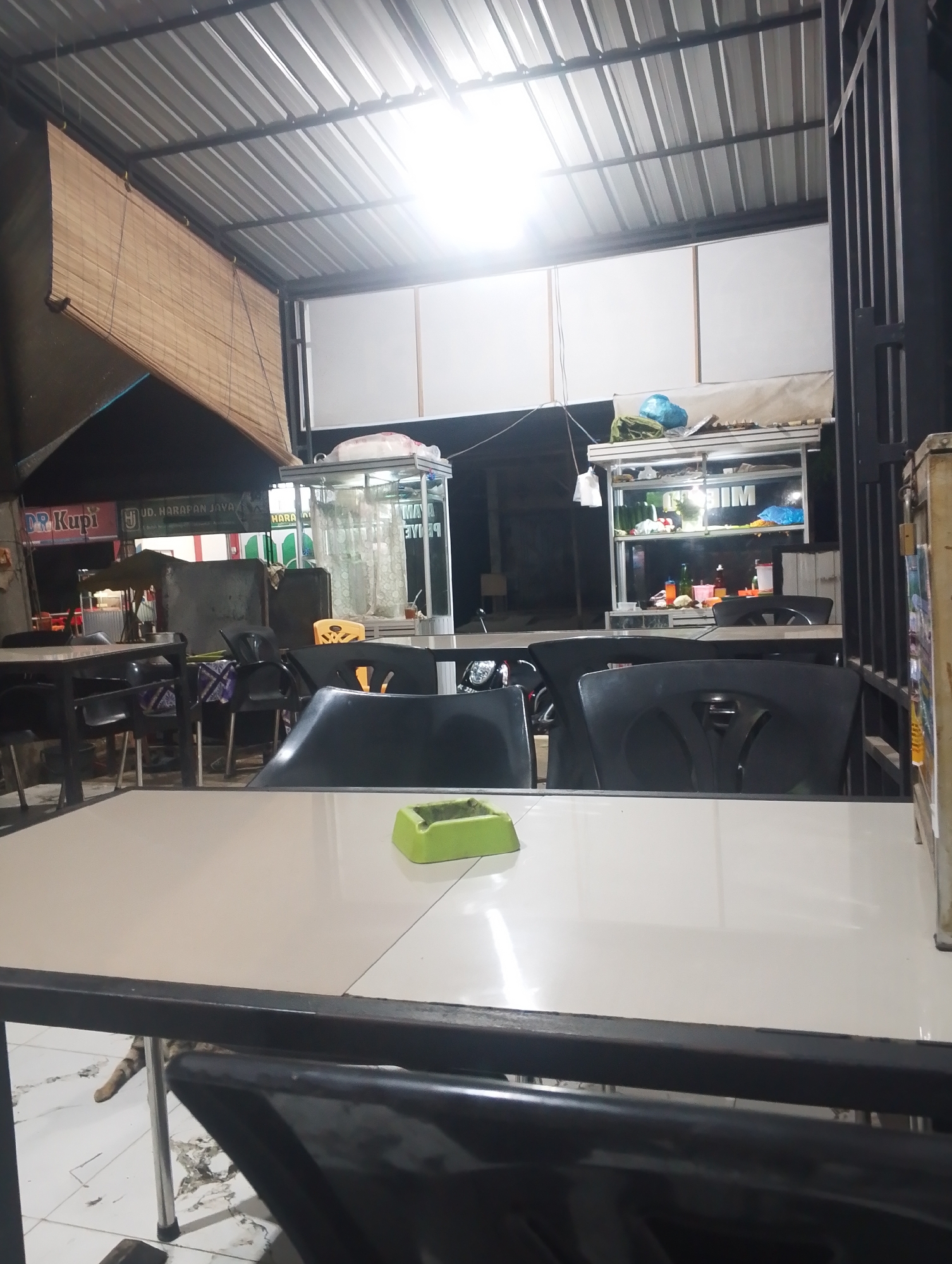 restaurant in Cotseutui, Indonesia. There are tables and chairs arranged under a metal roof. A light green ashtray is on a white table in the foreground. There are food carts in the background, and signs in Indonesian are visible on nearby buildings. A cat's tail is seen under one of the tables.