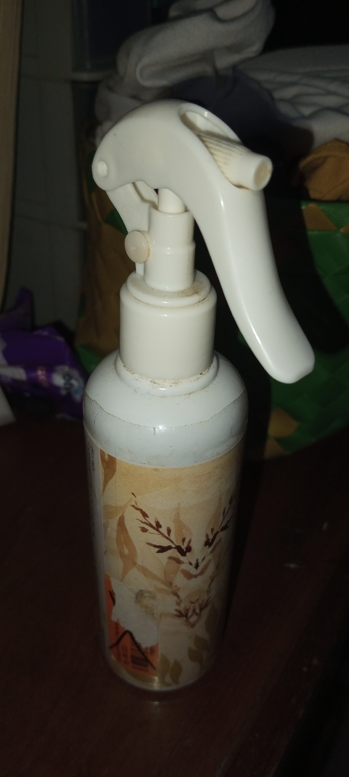 A white plastic spray bottle with a white spray nozzle sits on a dark surface. The bottle's label features a design with brown branches and leaves on a beige background. The bottle appears slightly worn, with some dirt visible around the nozzle and top rim. The background is cluttered with various objects, including fabrics and containers in muted colors. The lighting is dim, casting shadows that obscure details in the background.