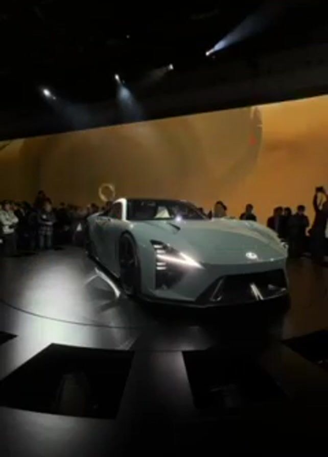sleek, light blue sports car with a white roof, presented on a rotating black platform in front of a crowd of people. The background features a large screen displaying abstract golden-brown imagery. The lighting is theatrical, with spotlights highlighting the car and stage area, while the rest of the venue is dimly lit. People in the audience are standing and observing the car, some holding up phones to capture photos or videos. The overall atmosphere suggests a car reveal event or auto show.