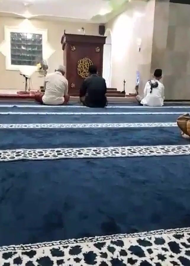 The interior of a mosque is shown. Four people sit cross-legged on the blue carpet, facing the front of the room. The carpet has a distinct pattern of irregular, leopard-like spots in white against the blue background. At the front, three people sit in a row, spaced apart from one another. The person on the left wears a light-colored shirt, the person in the middle wears a black shirt, and the person on the right wears a white shirt. Behind them is a wooden podium with Arabic writing on it. A fan is visible in the background, and there is a decorative window to the left. The room is well-lit. A portion of the fourth person is visible on the right, wearing brown patterned clothing.
