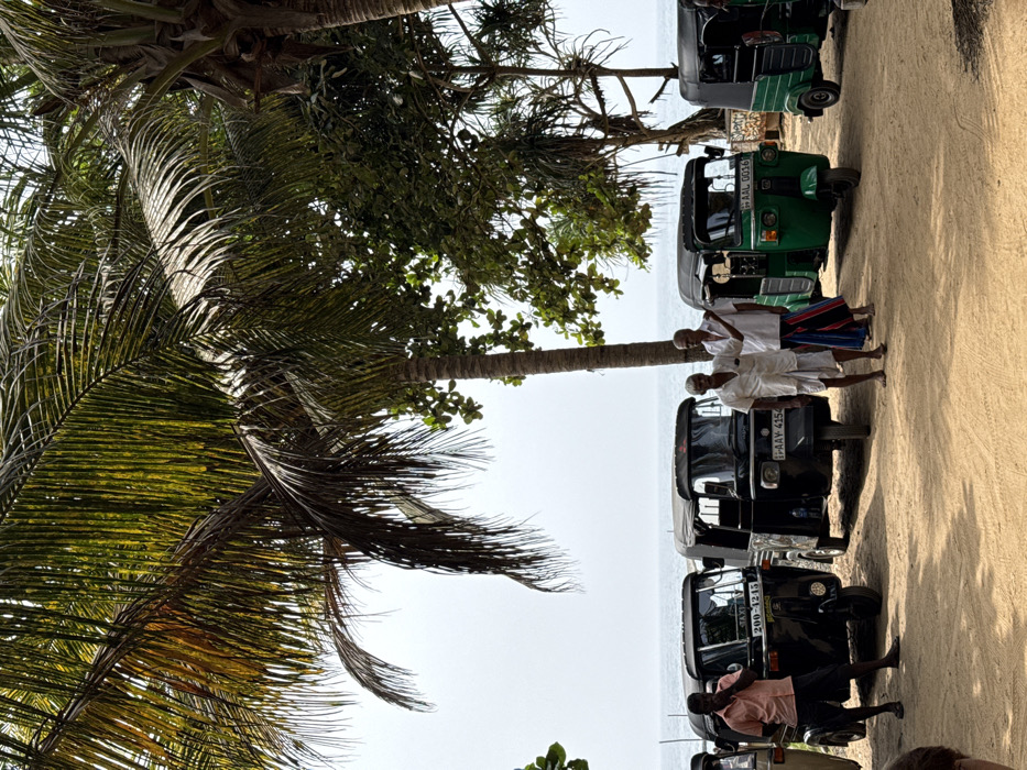 A row of tuk-tuks lines a sandy beach, partially obscured by lush foliage from a palm tree. Several men stand beside the vehicles. Two of the men are wearing white robes and appear to be posing. Beyond the tuk-tuks, the ocean stretches toward the horizon under a pale sky.