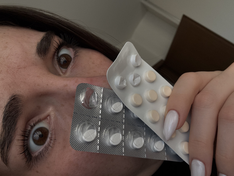 In Trud, Bulgaria, a close-up indoor photograph captures a female individual holding two blister packs of pills. The subject's face is partially obscured by the packaging, with her wide-open brown eyes, dark eyebrows, and visible freckles prominently displayed. Her right hand, featuring manicured nails with a light polish, secures the blister packs. The top pack is silver-colored, containing white, biconvex pills in multiple compartments, with at least one compartment visibly empty. The bottom pack is off-white and holds light beige, round pills, several of which remain, while other compartments are empty or torn. The background is out of focus, showing a light-colored surface on the left and a darker, brownish object on the right.