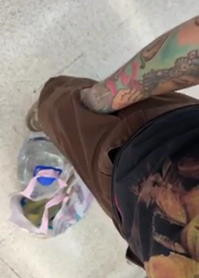 person standing in a brightly lit indoor space, possibly a store, with a tiled floor. The camera angle is positioned downward, focusing on the person's lower body and arm. The person is wearing brown pants and a black t-shirt with a design. Their left arm is highly tattooed, with visible images including a skull-like face and an eye symbol on the finger. A reusable shopping bag and a clear plastic bottle are on the floor near the person's feet. The person raises their tattooed hand and points at the camera with their tattooed finger, keeping their arm over the lower body. Part of a blue and white label is visible at the bottom of the frame.