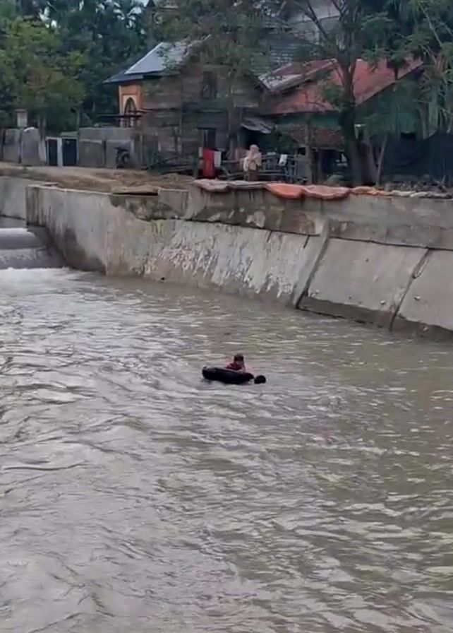 Two children are floating on an inner tube in a river with concrete embankments. The river is muddy and the water is flowing. A building is visible in the background.