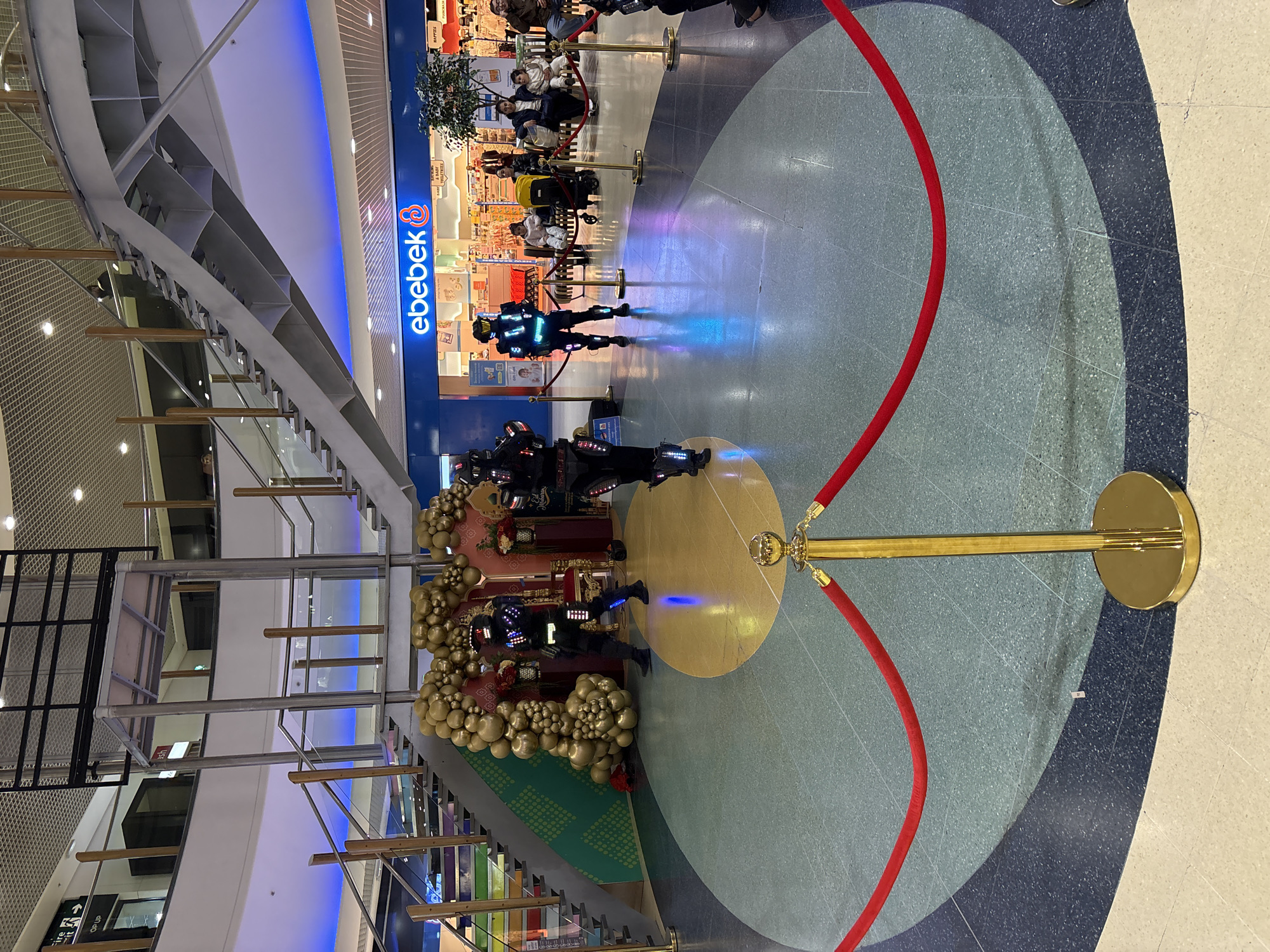 The image depicts an indoor scene within Westfield Stratford City, London, United Kingdom. Three individuals in dark, futuristic, illuminated costumes featuring blue and red lights are centrally positioned on a circular, patterned tiled floor. Behind them, to the left, is a festive display with a golden balloon arch, a red-gold throne, and floral arrangements. A red velvet rope, held by gold stanchions, marks the foreground, separating the performers from the viewing area. In the background, the "ebebek" children's store with a prominent blue sign is visible. To the right of the store, several adults and children are seated on a bench, with a yellow stroller nearby. The environment is a multi-level shopping mall, characterized by a large staircase with metal and wood railings, an elevator shaft, a grid ceiling with recessed lighting, and blue accent lighting along the upper floor's underside.